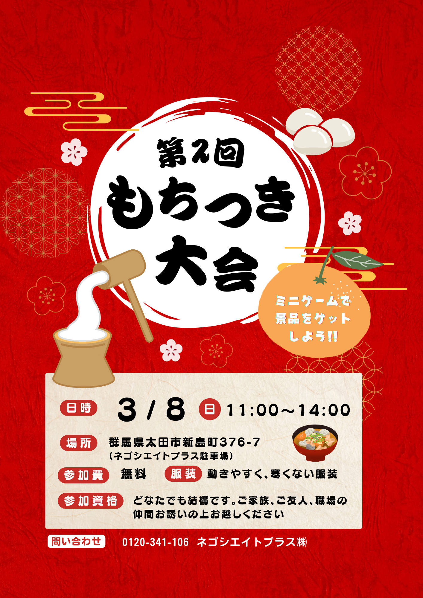 3/8お餅つき大会のお知らせ 2026.03.04 今週末3/8(日)に2/8に雪で延期となった餅つき大会を開催いたします。 ご家族、お友だちといっしょにお越しください。 おもちつきの他にも素敵な景品がもらえる楽しいミニゲーム大会もございますので 是非足を運んでみてください。 Post Share LINE note